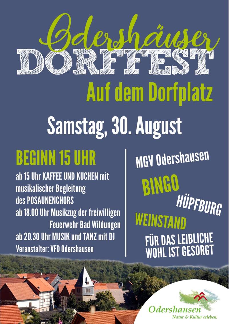 Am 30.08.2025 lädt der Ortsbeirat Odershausen zusammen mit dem VFD zum Dorffest auf den Dorfplatz an der Turnhalle ein.